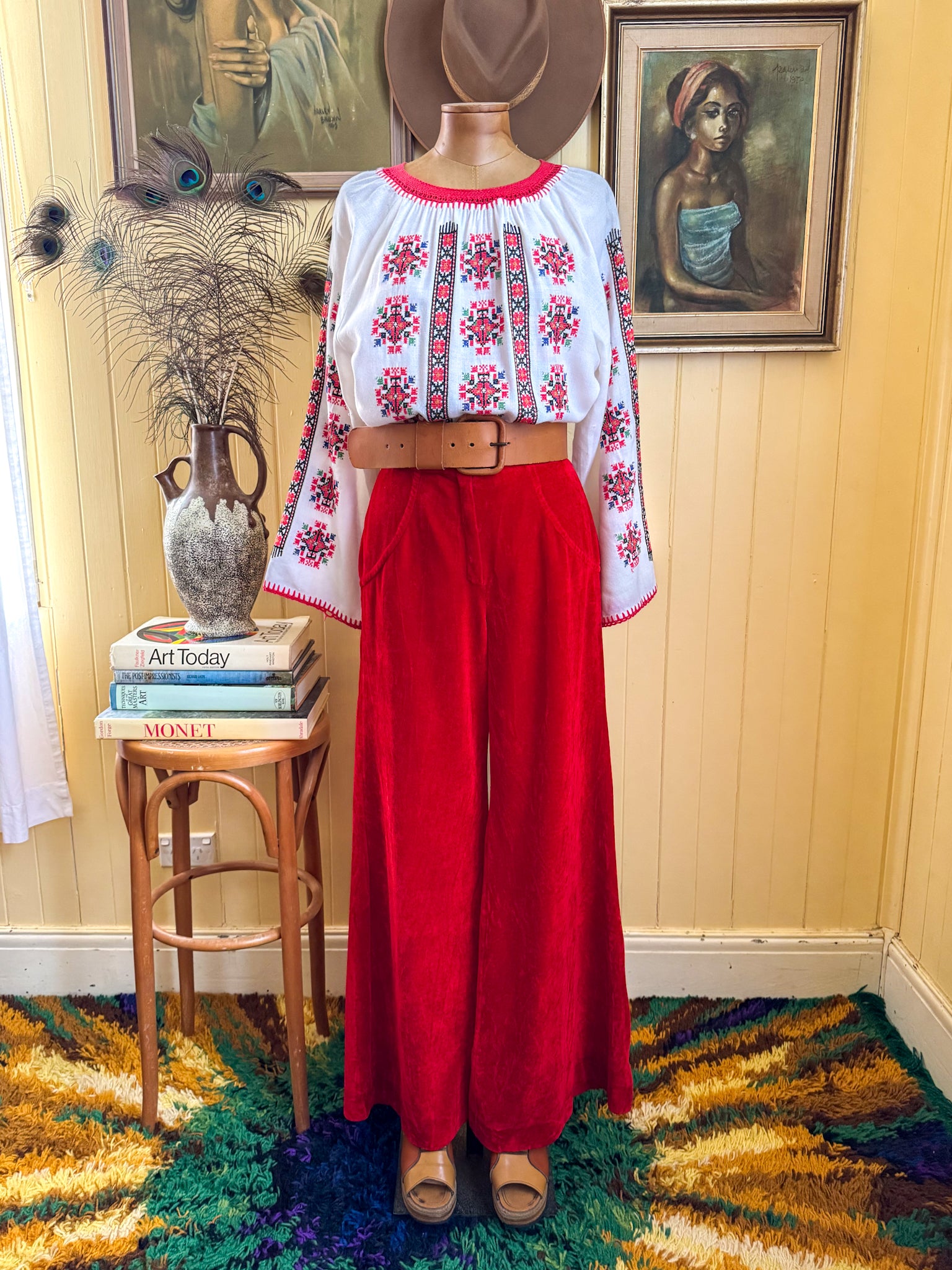 This pair of ultra groovy velvet flares hail from the early 1970’s, I got them from their original owner who was quite the cool cat back in her day. Crafted by St George in a comfortable tractate nylon velvet in a rich ruby red hue, they feature a mid/high rise, front zip fastening, seam design on the hips, no back pockets, are fitted around the butt and thighs and then finish with a wide super flared leg.