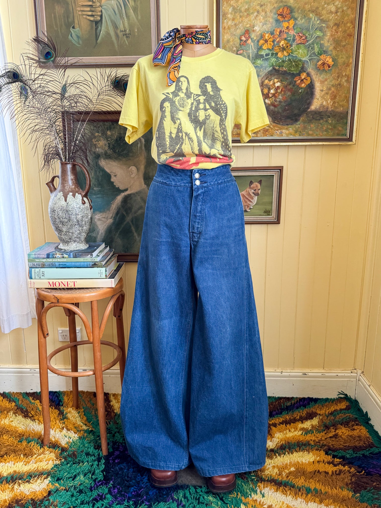 Is there anything more elusive than the holy grail of vintage jeans, the perfect 70s high waisted, butt enhancing, wide leg denim? Well, look no further than this groovy pair of original Staggers flares. Crafted in a mid weight cotton denim in a gorgeous mid blue wash, these babies have all the fabulous 70s stylings: a super high waist, front side slit pockets, press stud and zip fastening, are fitted around the butt and hips and the flares out into a flattering super (and I mean SUPER) wide leg. Very long too, perfect for the taller vintage lovers.