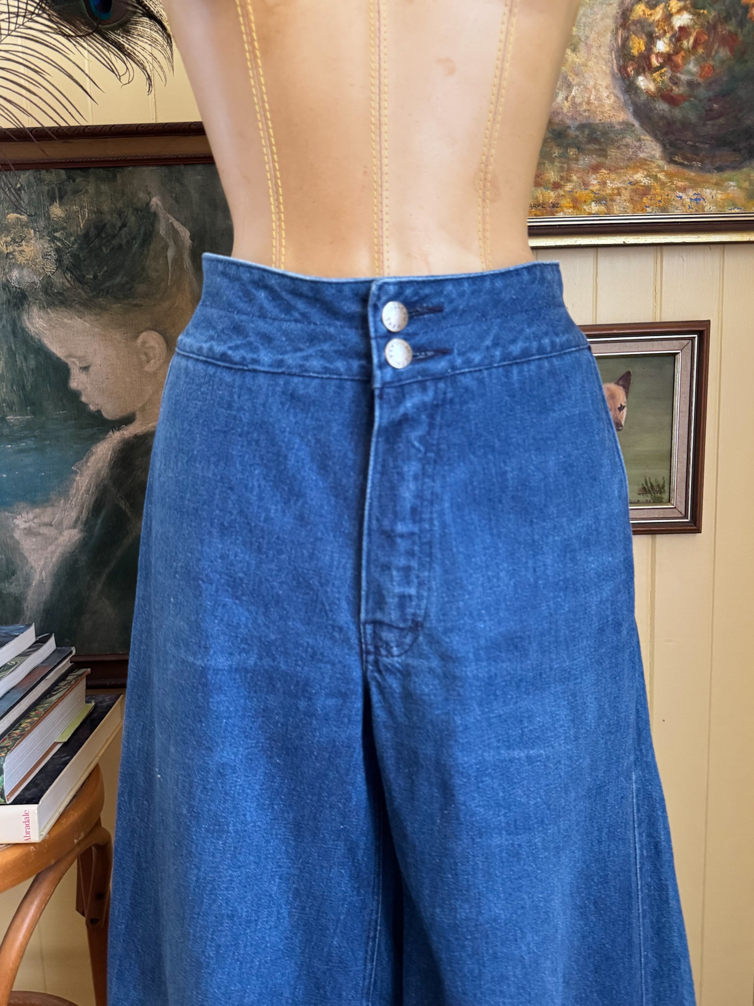 VINTAGE 1970S STAGGERS WIDE LEG SUPER FLARE BELLBOTTOM HIGH WAIST DENIM JEANS M/L