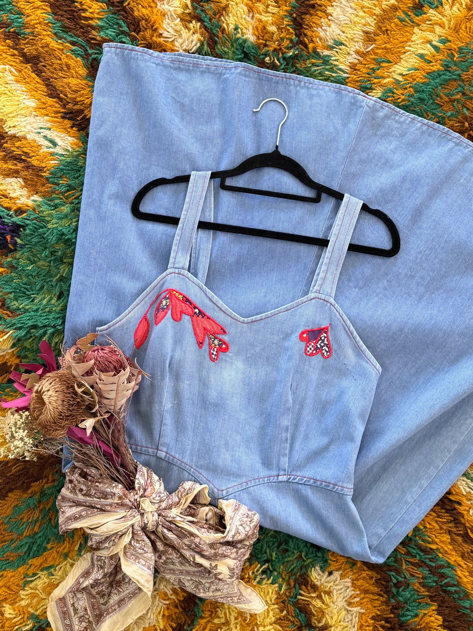 VINTAGE 1970S STITCHES CHAMBRAY DENIM APPLIQUÉ MIDI PINAFORE DRESS M/L