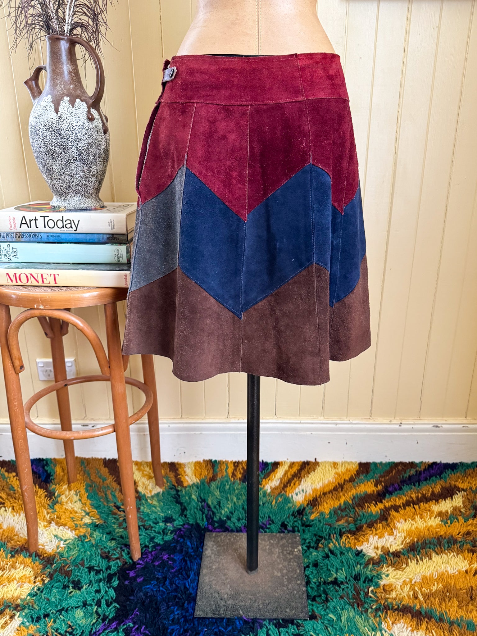 VINTAGE 1970S SUEDE LEATHER CHEVRON COLOUR BLOCK SKIRT M/L