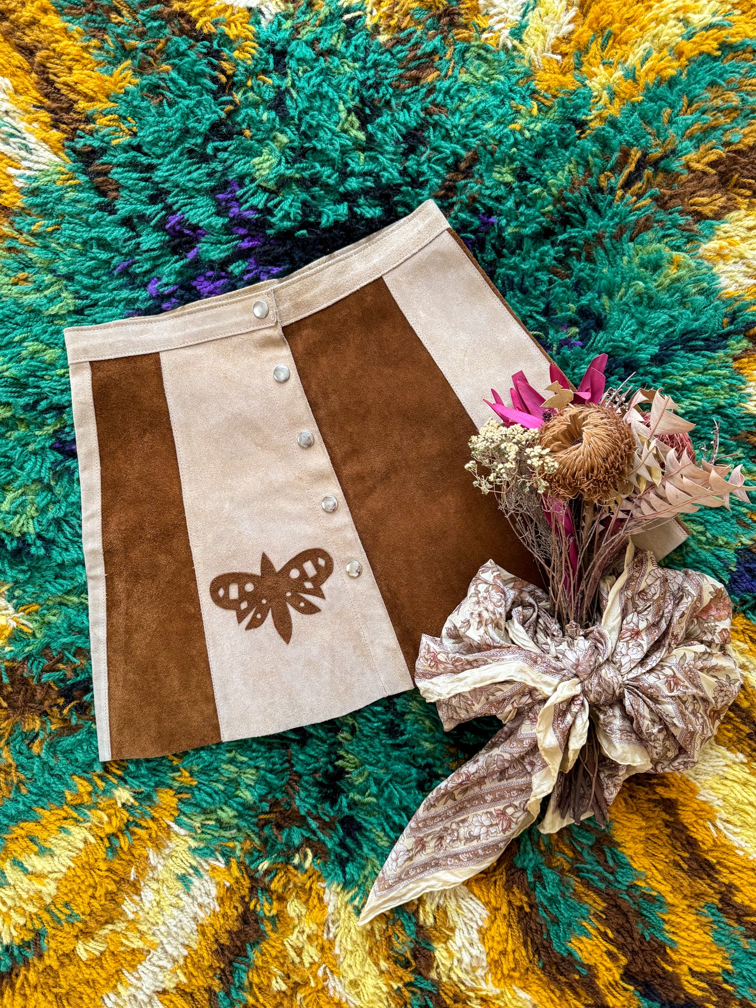 VINTAGE 1970S SUEDE LEATHER PANEL BUTTERFLY APPLIQUÉ BUTTON THROUGH MINI SKIRT S/M