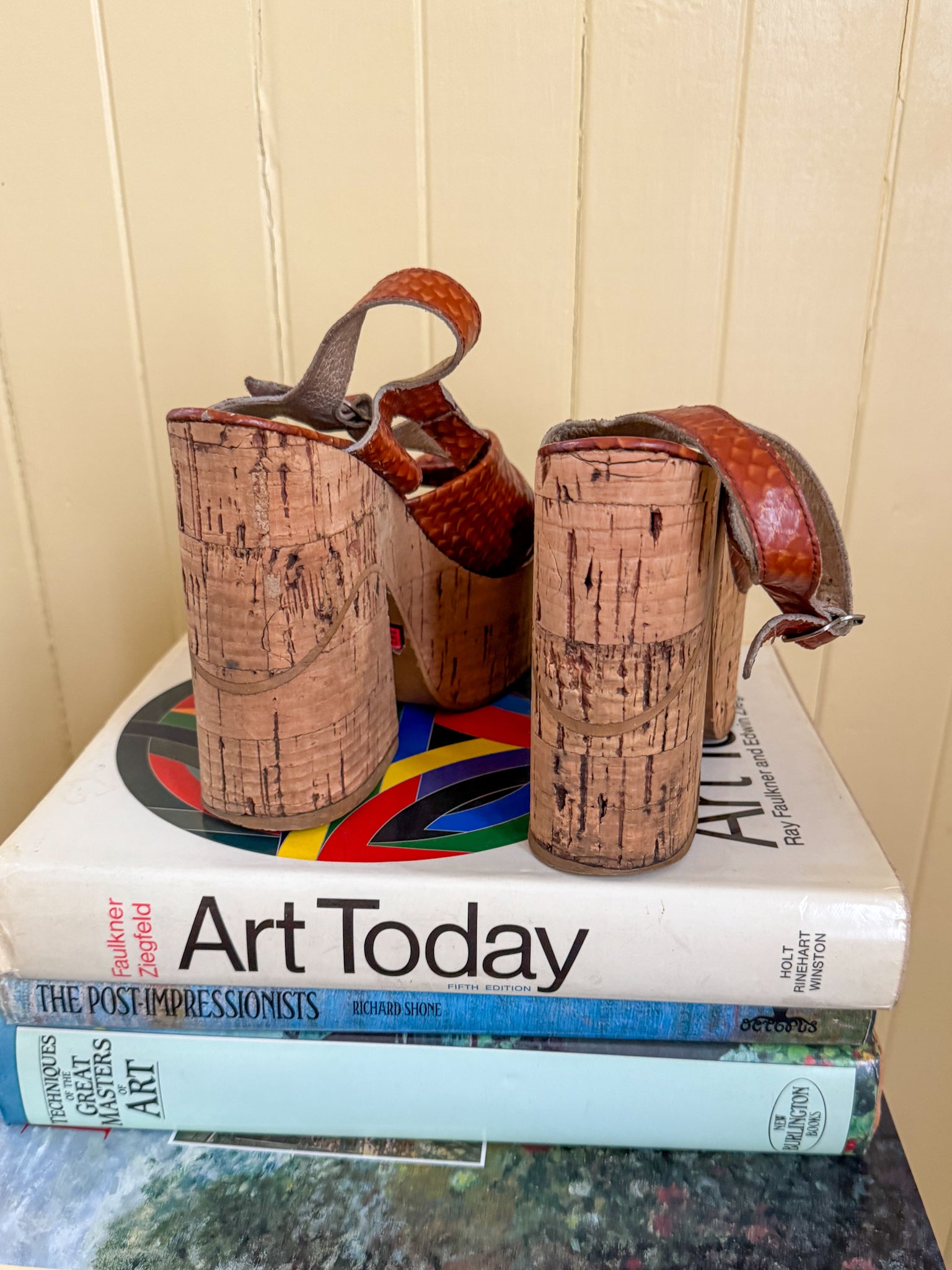 VINTAGE 1970S TAN LEATHER SNAKE EFFECT CORK SUPER PLATFORM SANDALS 6/37