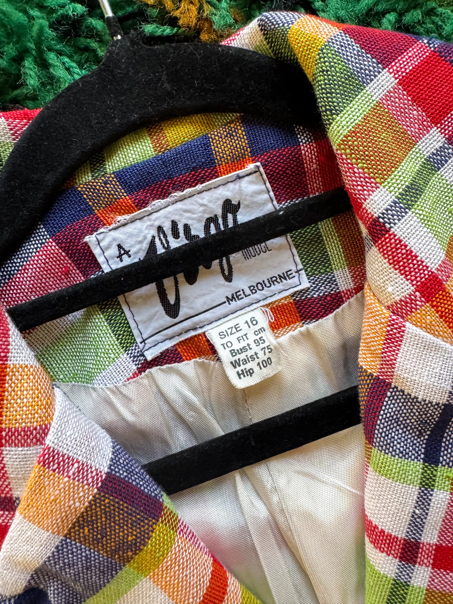 Introducing this groovy plaid number, straight from the 1970's to you. Crafted by label Virgo in a a woven cotton in the most fabulous rainbow oversized plaid print, with a huge dagger collar, gold button fastenings, front patch pockets and is cut in an ultra-flattering tailored blazer silhouette in an easy wear hip length.