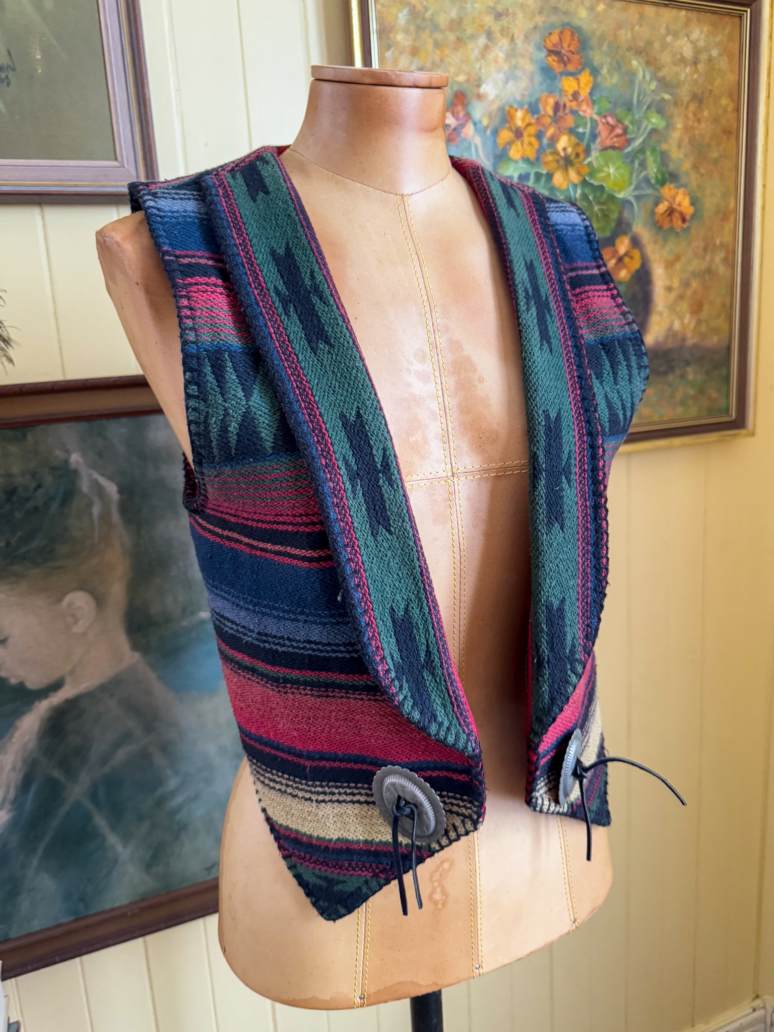 VINTAGE 1980S AMERICAN SHARON YOUNG COTTON SERAPE WOVEN CONCHO VEST S