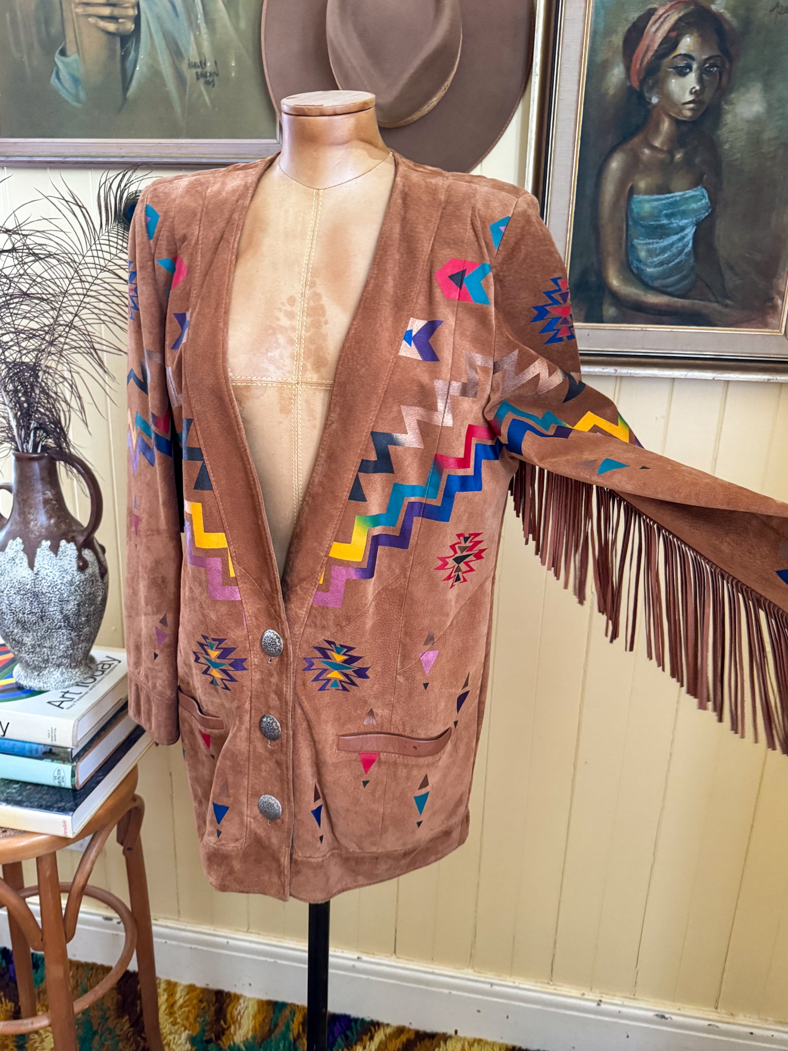 VINTAGE 1980S PANACHE SUEDE FRINGED PAINTED WESTERN JACKET S/M