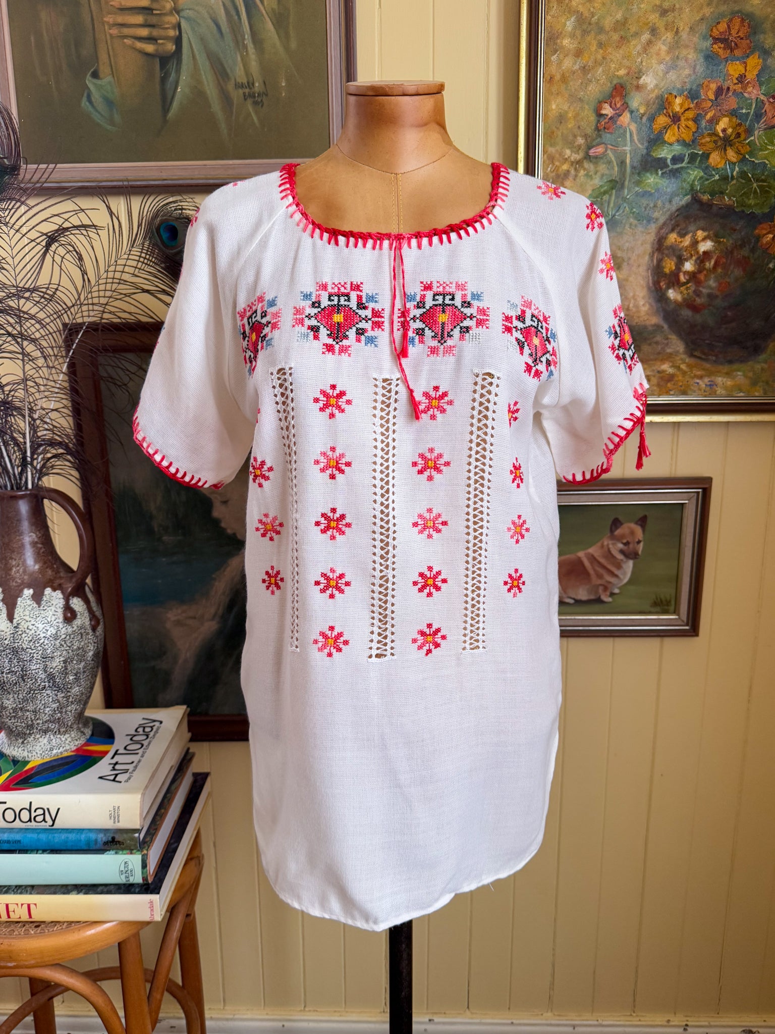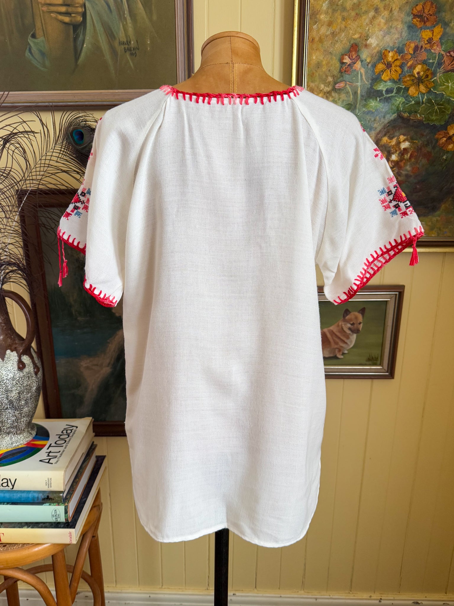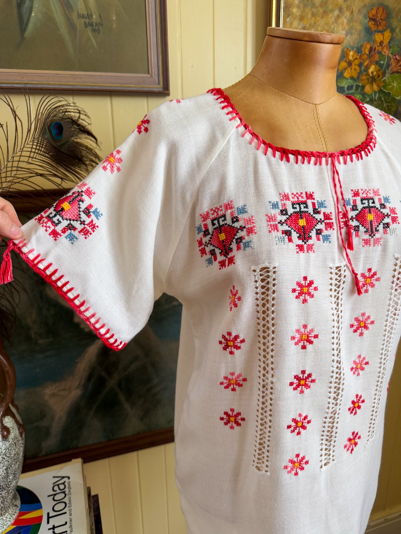 Romanian peasant blouses are a tried and true vintage folk favourite. Crafted in a woven fabrication (no tags, feels like an acrylic blend) in a creamy white colourway, this free spirited blouse features beautiful traditional motif embroidery throughout. She has full short sleeves, a round neck with small rope ties and red blanket stitching around the hems. Just magical.