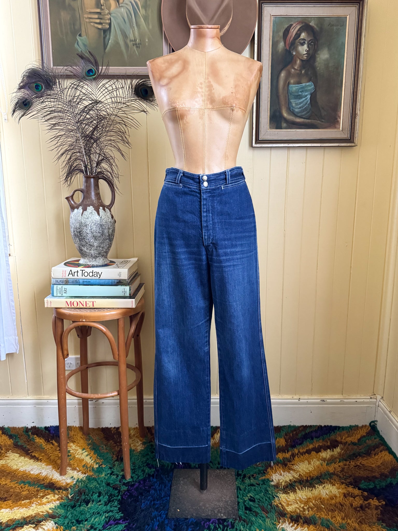 Condition: Very good vintage condition with light wear consistent with age. Some fade in the denim as expected and a couple of slubby bits, also the hems have been altered a few times (they are still finished with a thin hemline) but there is a line where they were hemmed for a while.