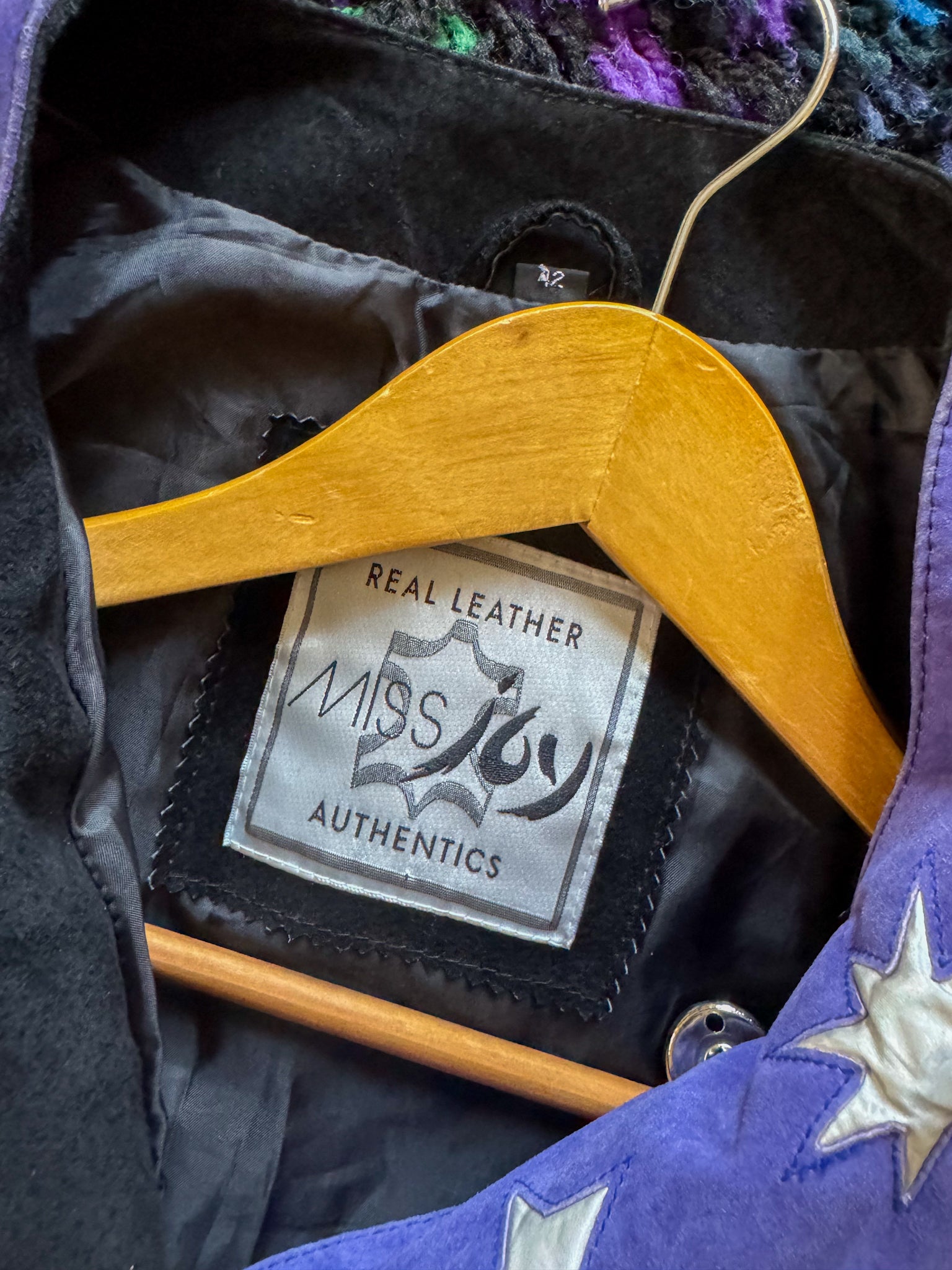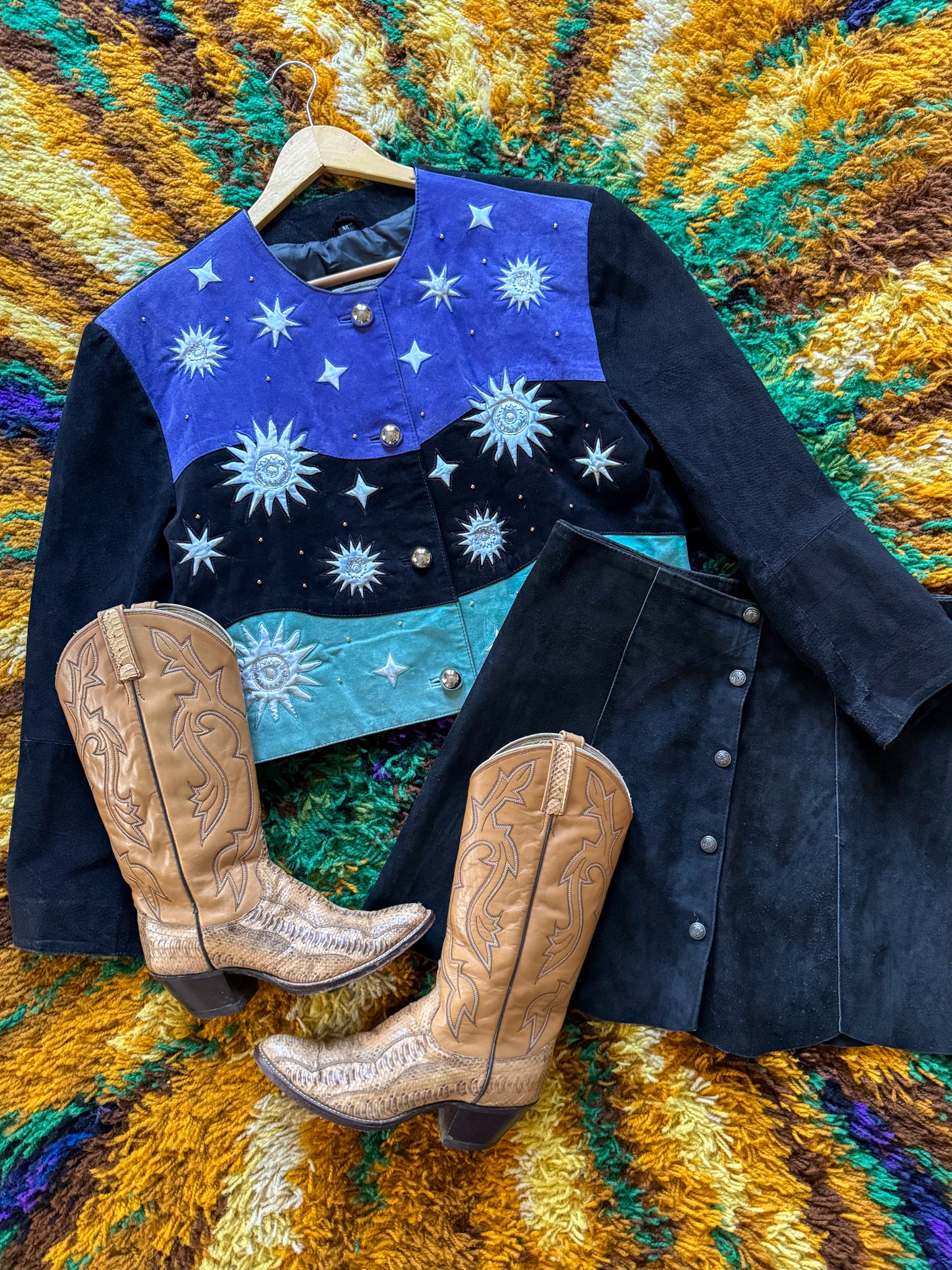 The '80s are known for the grooviest pieces in unique silhouettes and this suede leather number is no exception. Crafted in a buttery soft suede leather in a unique purple, turquoise and black colour block, she is adorned with magical silver celestial appliqué on the front. Cropped and boxy in cut and style, with oversized front buttons and lined in black satin, she is perfection throw on over any outfit as the ultimate vintage finishing touch.