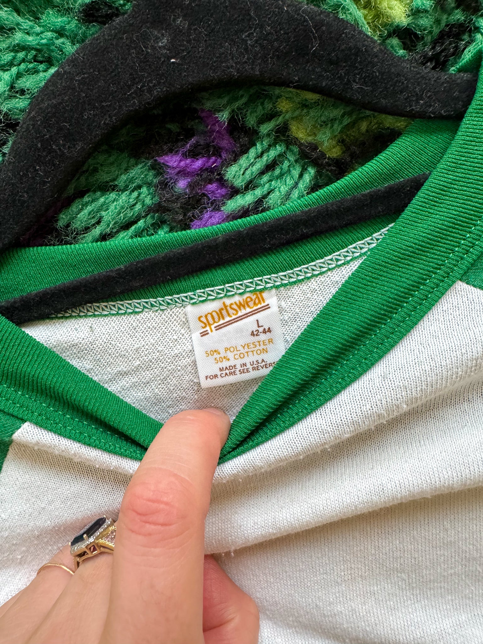 An iconic Air Supply ringer tee, in a white and green colourway, from their 1982 world tour. The tee features a print on both the front and back, contrast neck binding, three quarter sleeves and a curved raw cut hem.