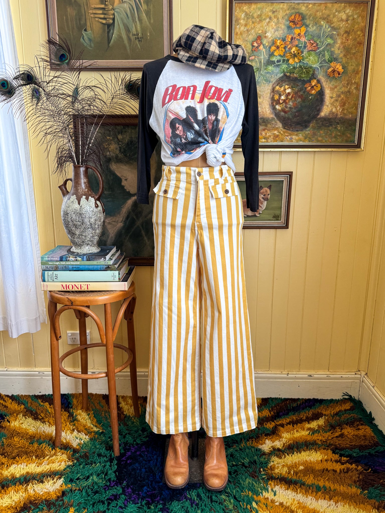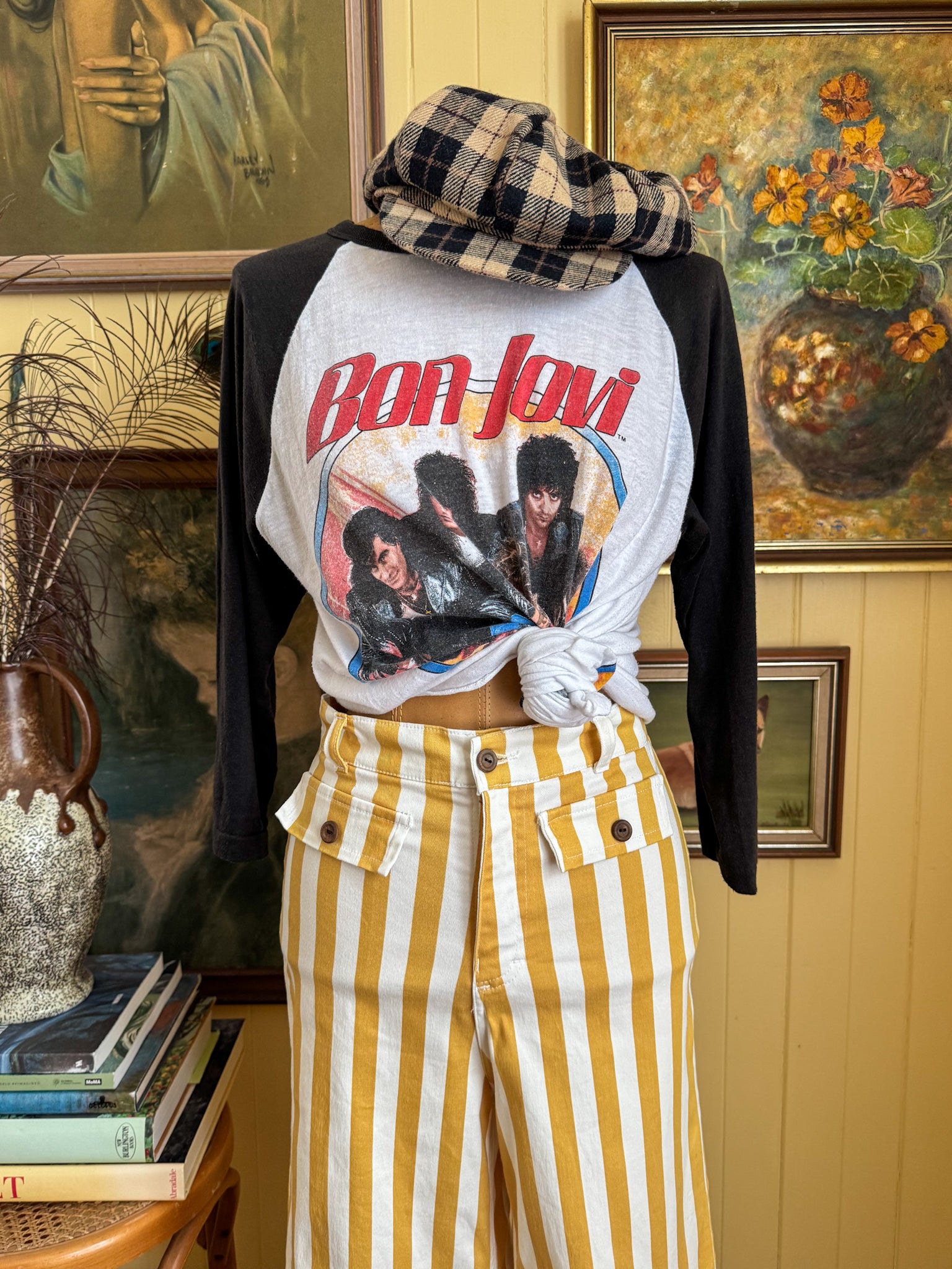 A badass Bon Jovi ringer tee, in a white and black colourway, from their 1987 Slippery When Wet world tour. The tee features a print on both the front and back, contrast neck binding, three quarter sleeves and a curved hem.