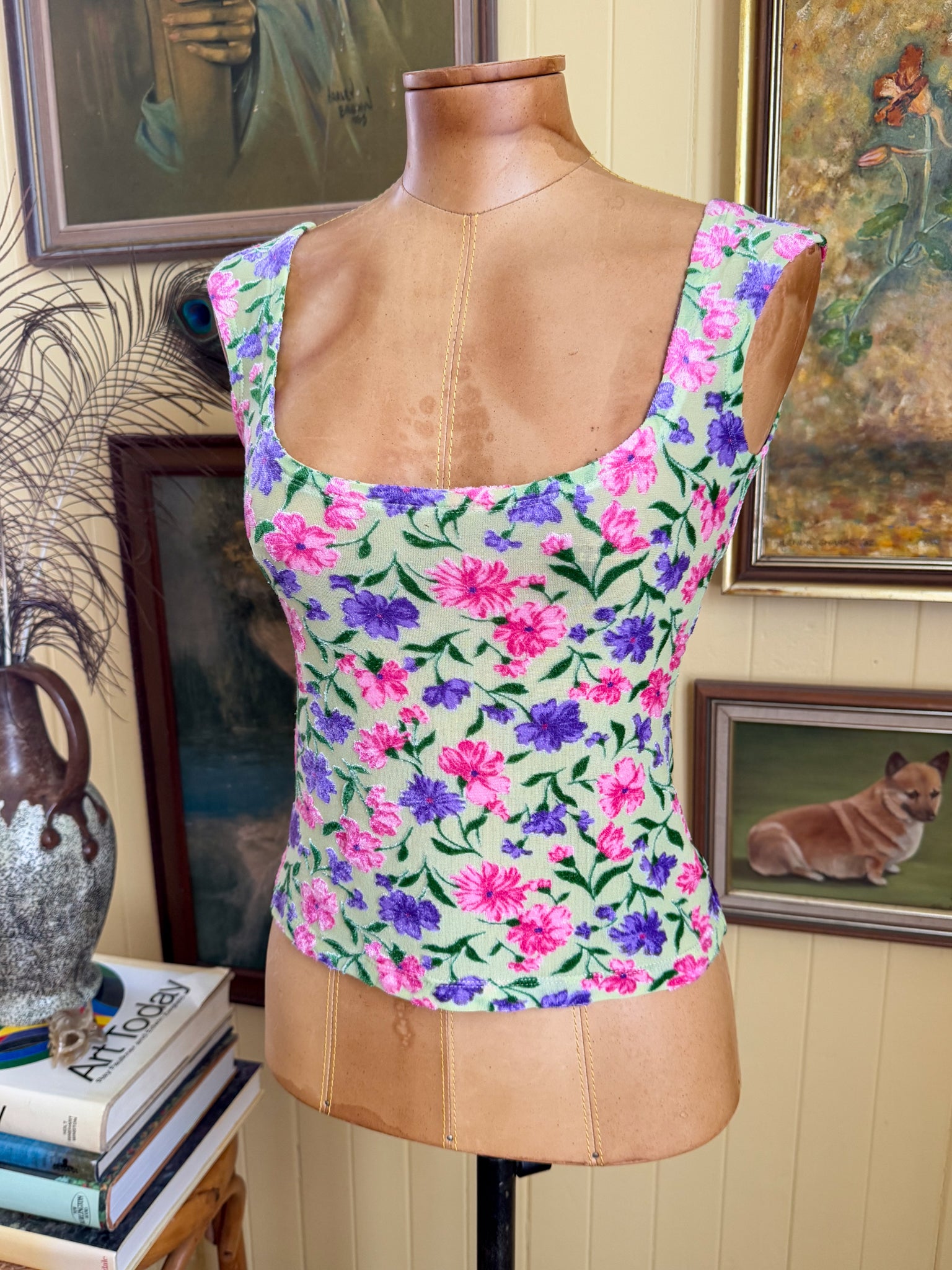 VINTAGE 1990S AUSTRALIAN PIERUCCI FLORAL VELVET BURNOUT TANK TOP S