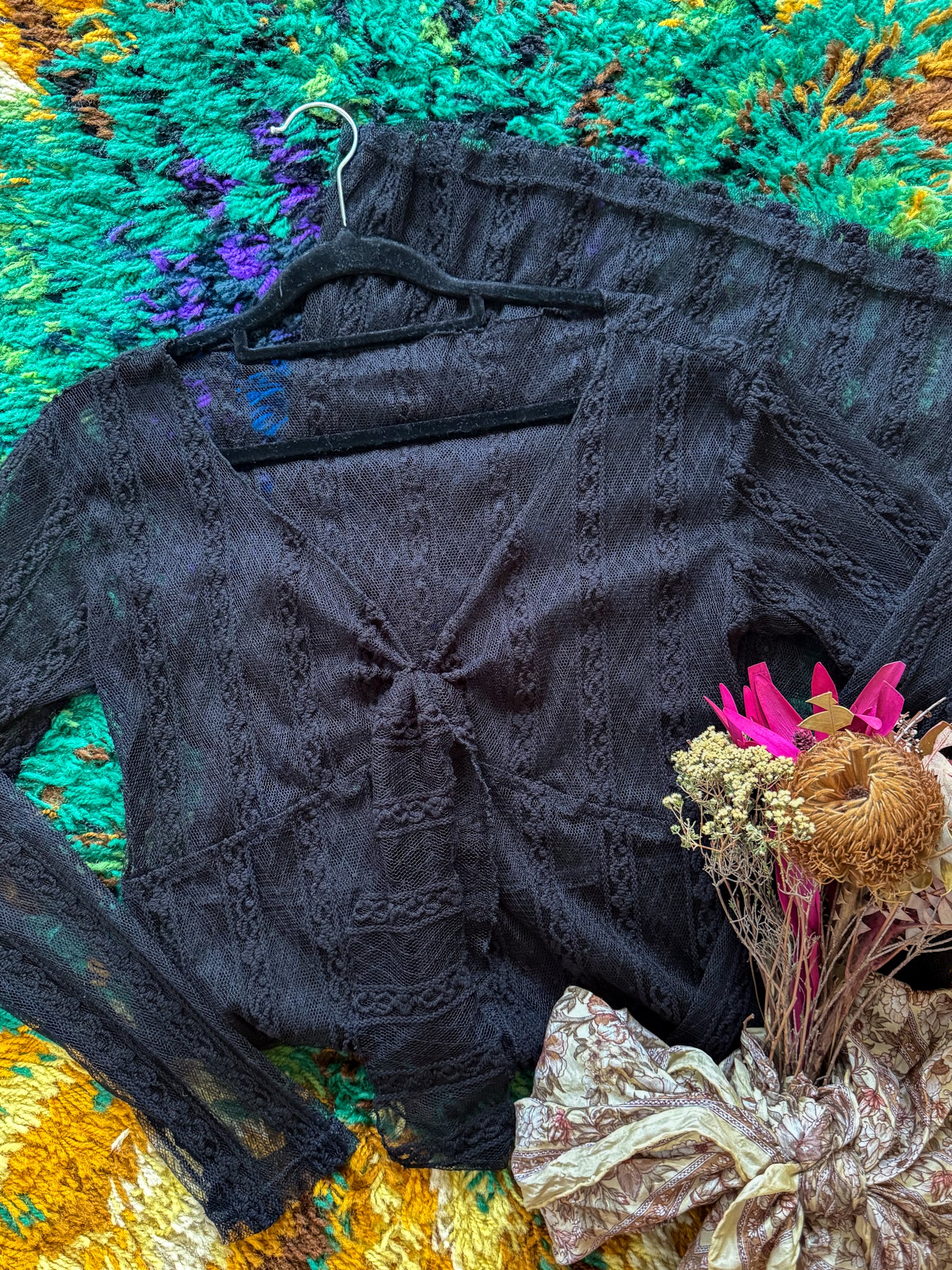 VINTAGE 1990S AUSTRALIAN SHEER BLACK LACE TIE FRONT MIDI DRESS M/L