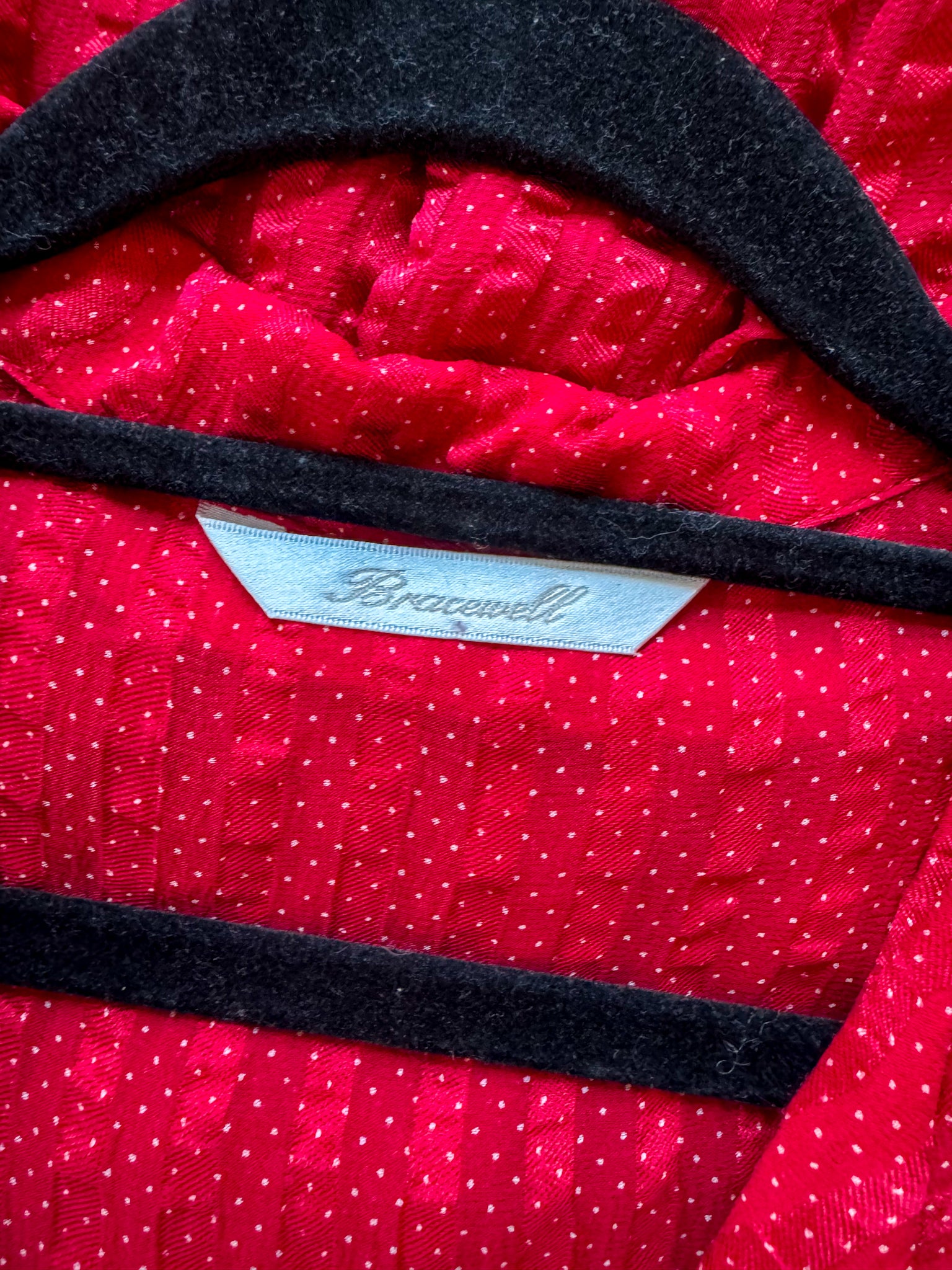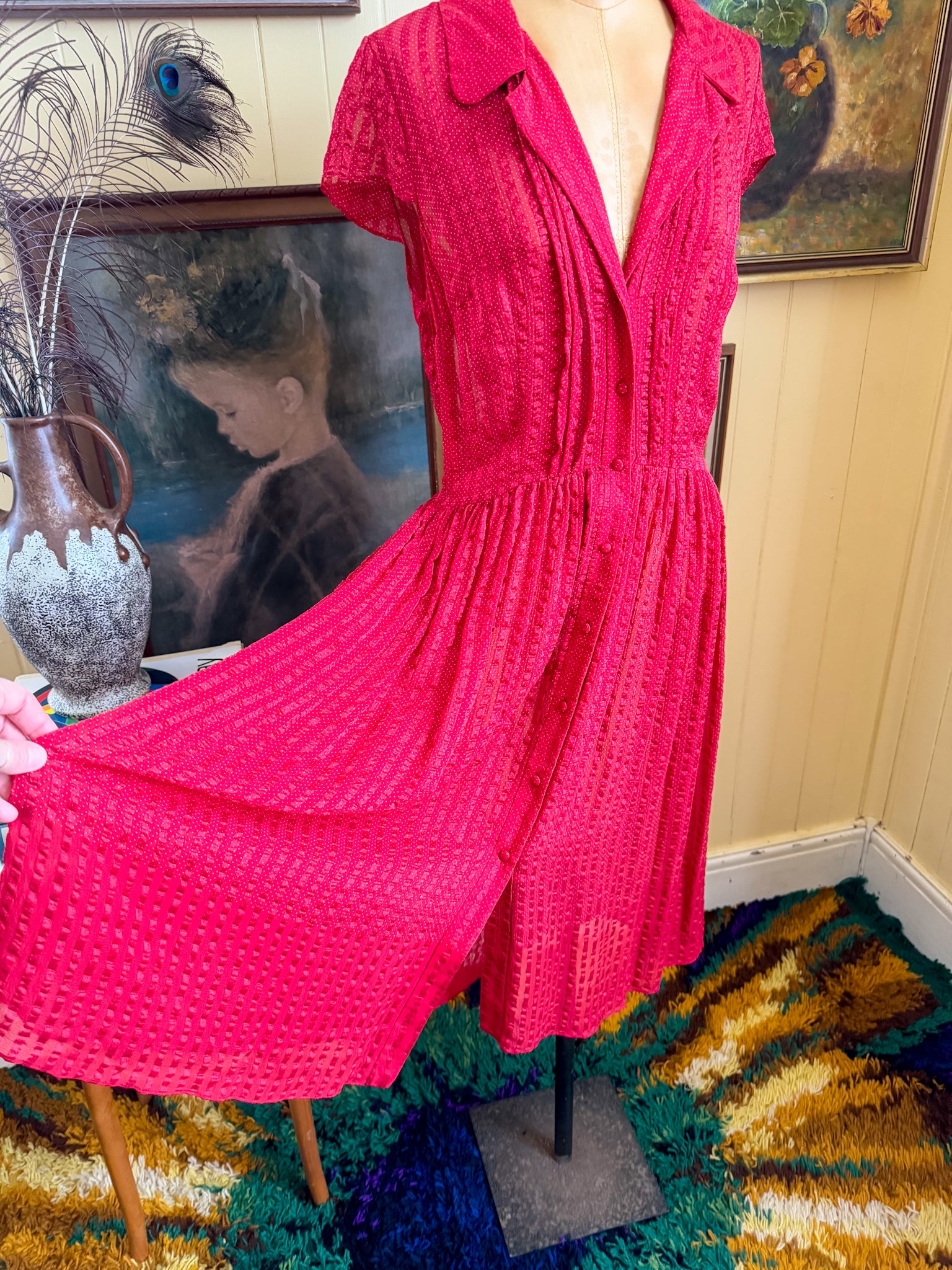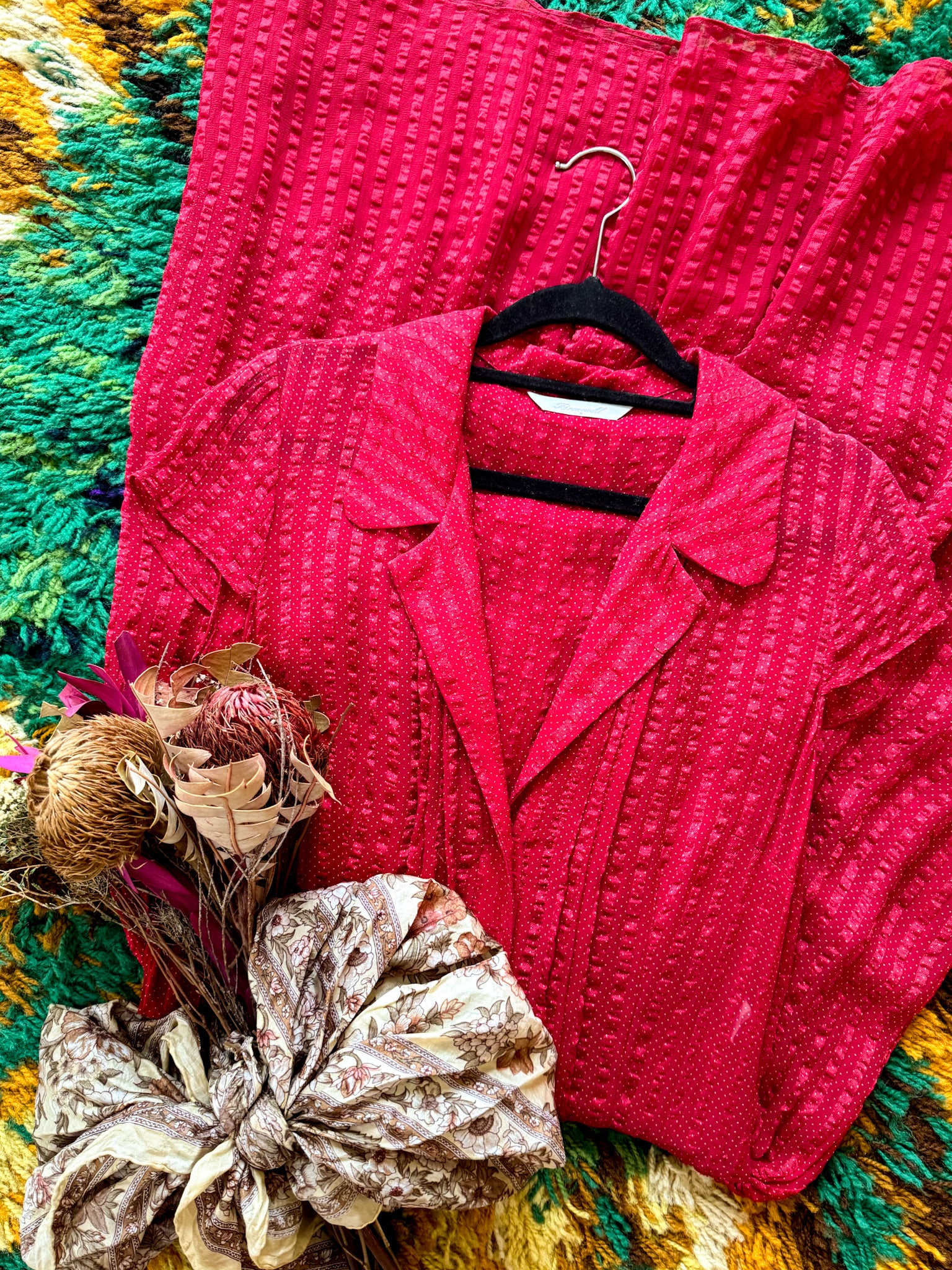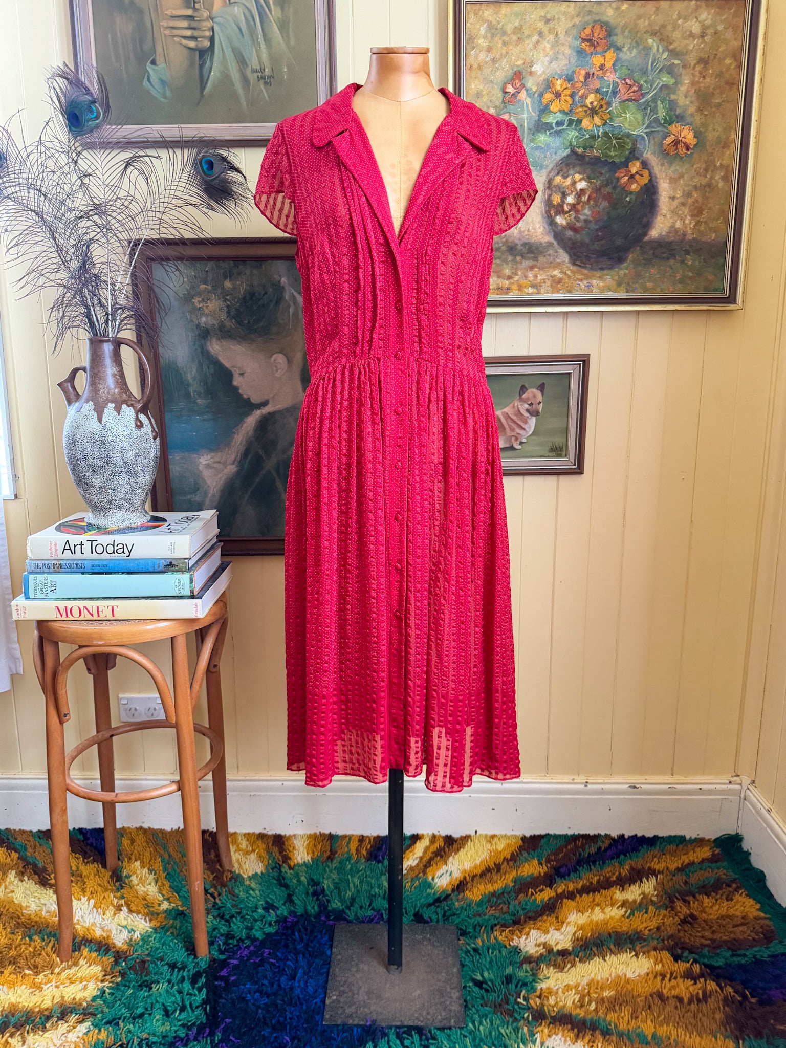 This is the sweetest minimalist dress from 90s Australian designer label Bracewell. Crafted in a light and floaty pure silk fabrication in a delicious raspberry red self stripe, this pretty piece features a collar with button through front, short sleeves, a relaxed fixed waist and an effortless midi skirt. Just beautiful.