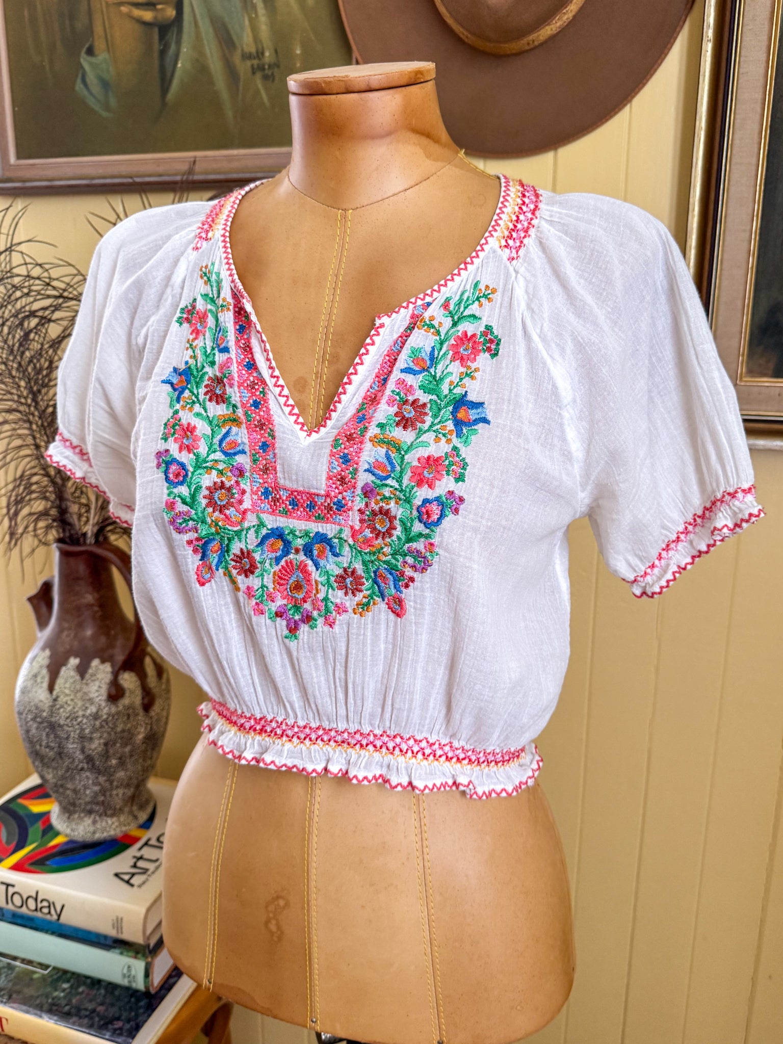 An embroidered peasant top is a key element in any Woodstock-inspired wardrobe. Crafted in ultra light cotton cheesecloth in crisp white, this sweet blouse features the most exquisite floral embroidery detail at centre chest and on the sleeves, smocking detail throughout, v neck, short blouson sleeves with ruffled hems, and an elasticised waist with a cropped length. So pretty.