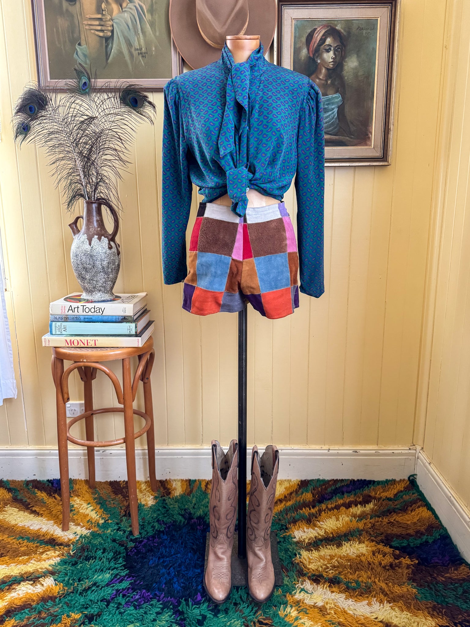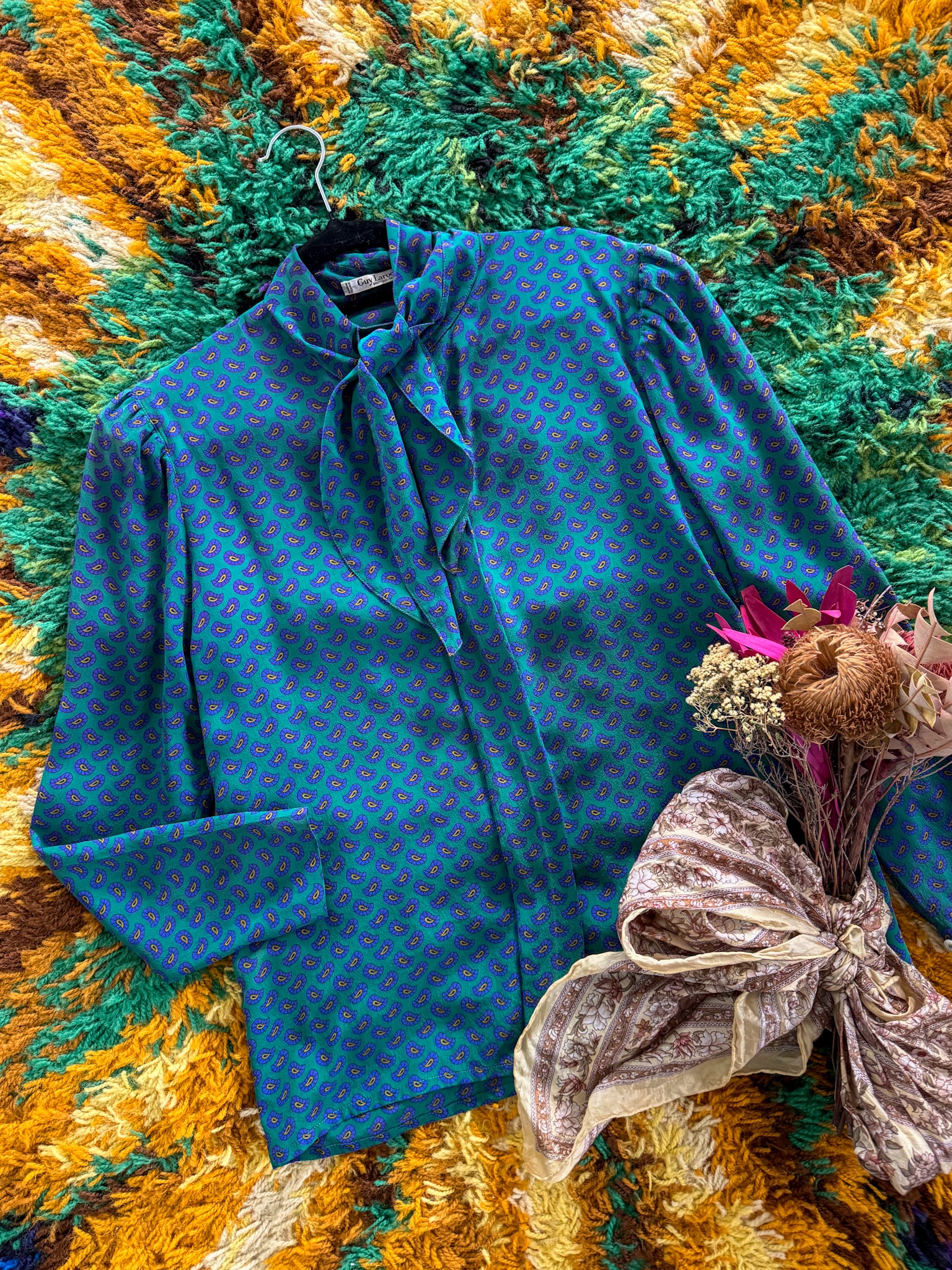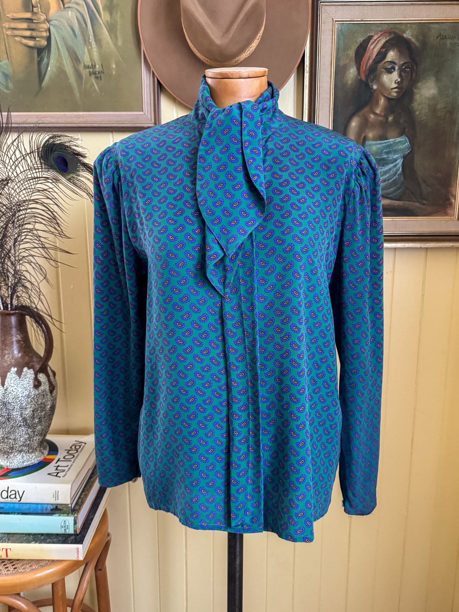 This exquisite designer blouse from Guy Laroche Paris is crafted in a delectable Italian silk fabrication in the prettiest teal paisley print. She has long neck ties that can be left loose or make the prettiest pussy bow, buttons through and has slightly blouson full length sleeves with button cuffs. A loose relaxed fit. The definitive fusion of modern + vintage.
