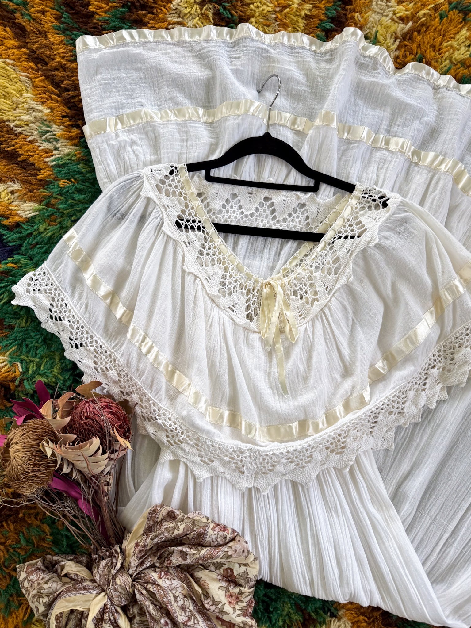 VINTAGE 1990S MEXICAN COTTON CHEESECLOTH RUFFLE CROCHET MIDI DRESS M/L/XL