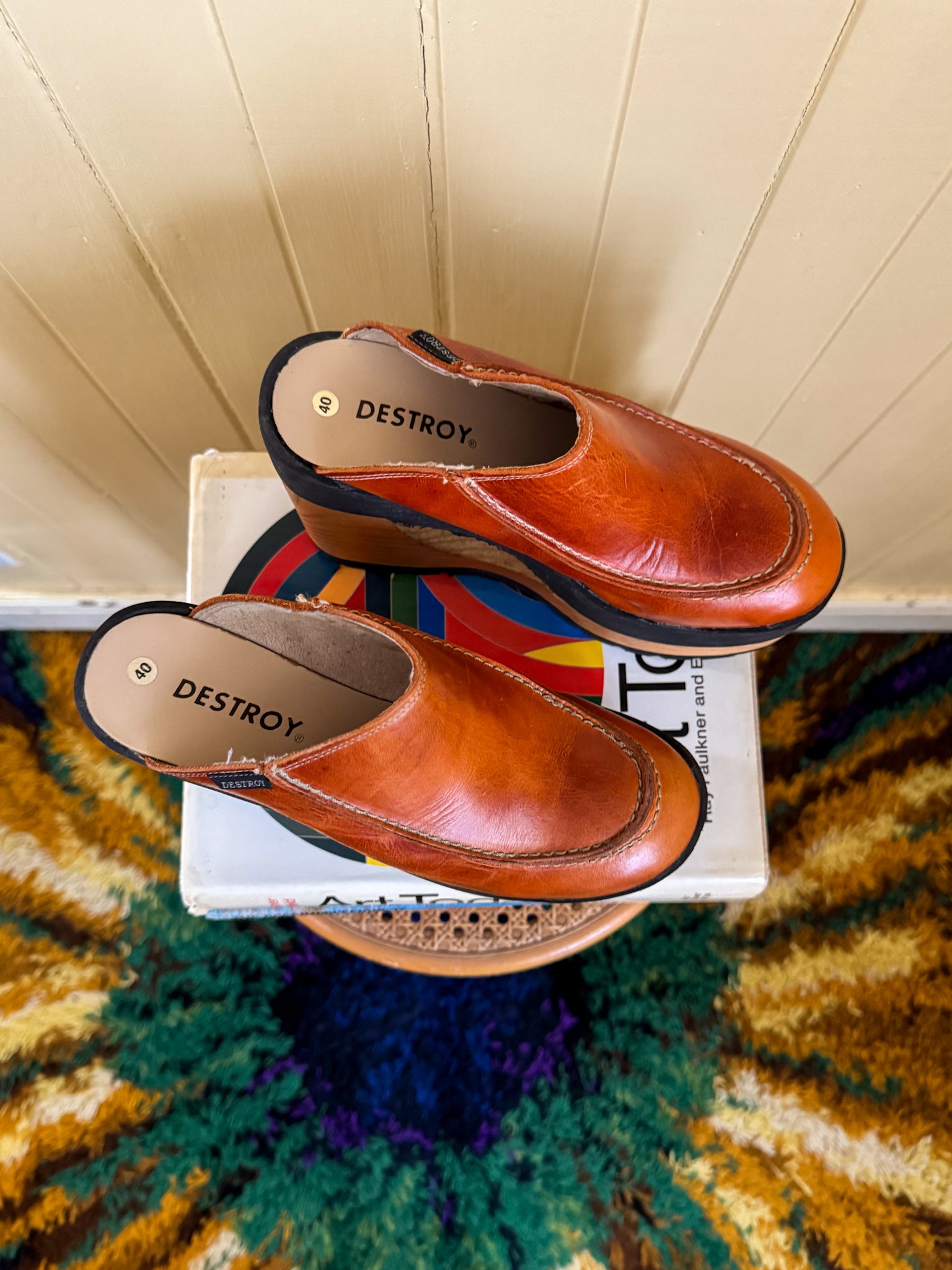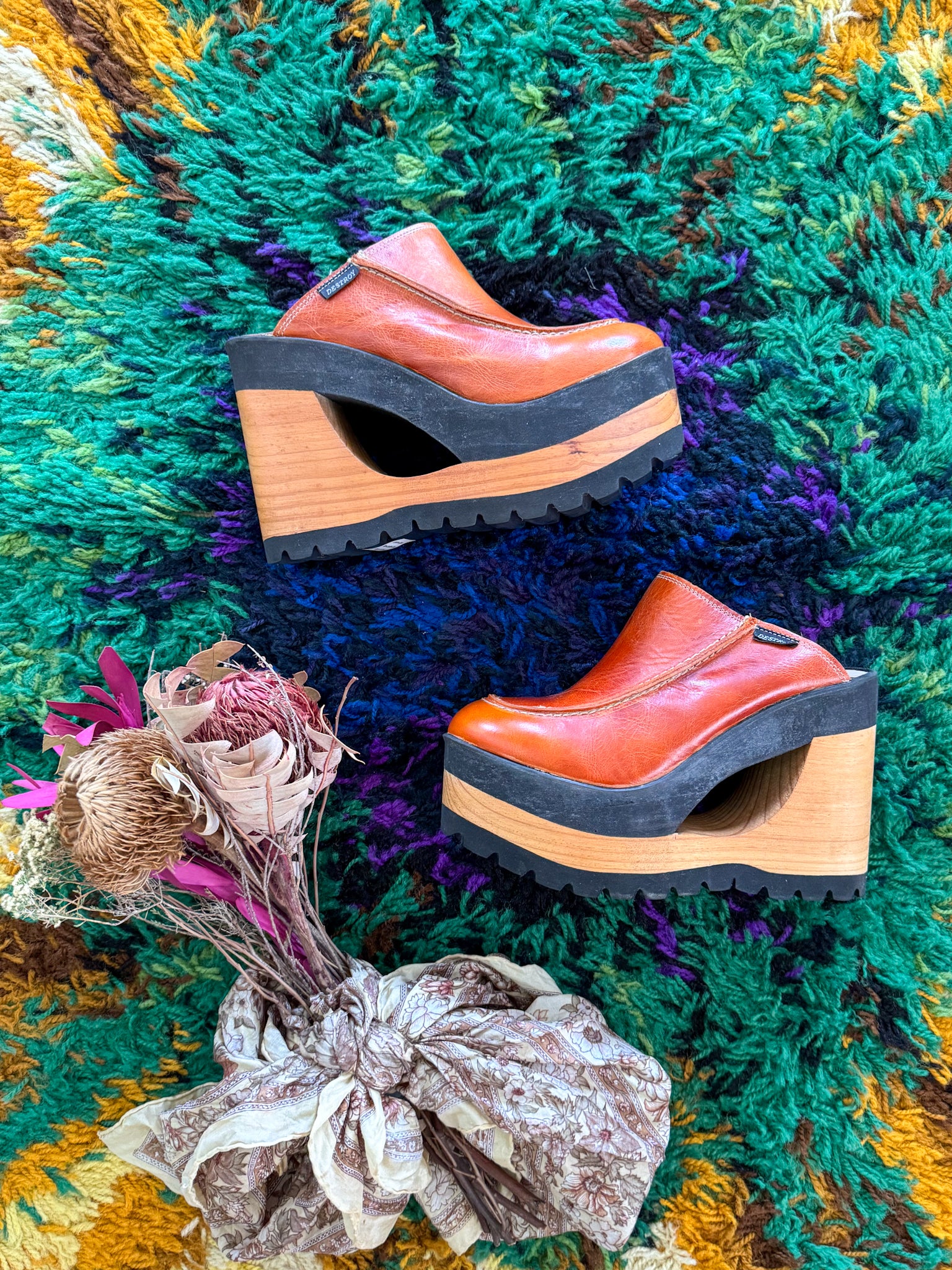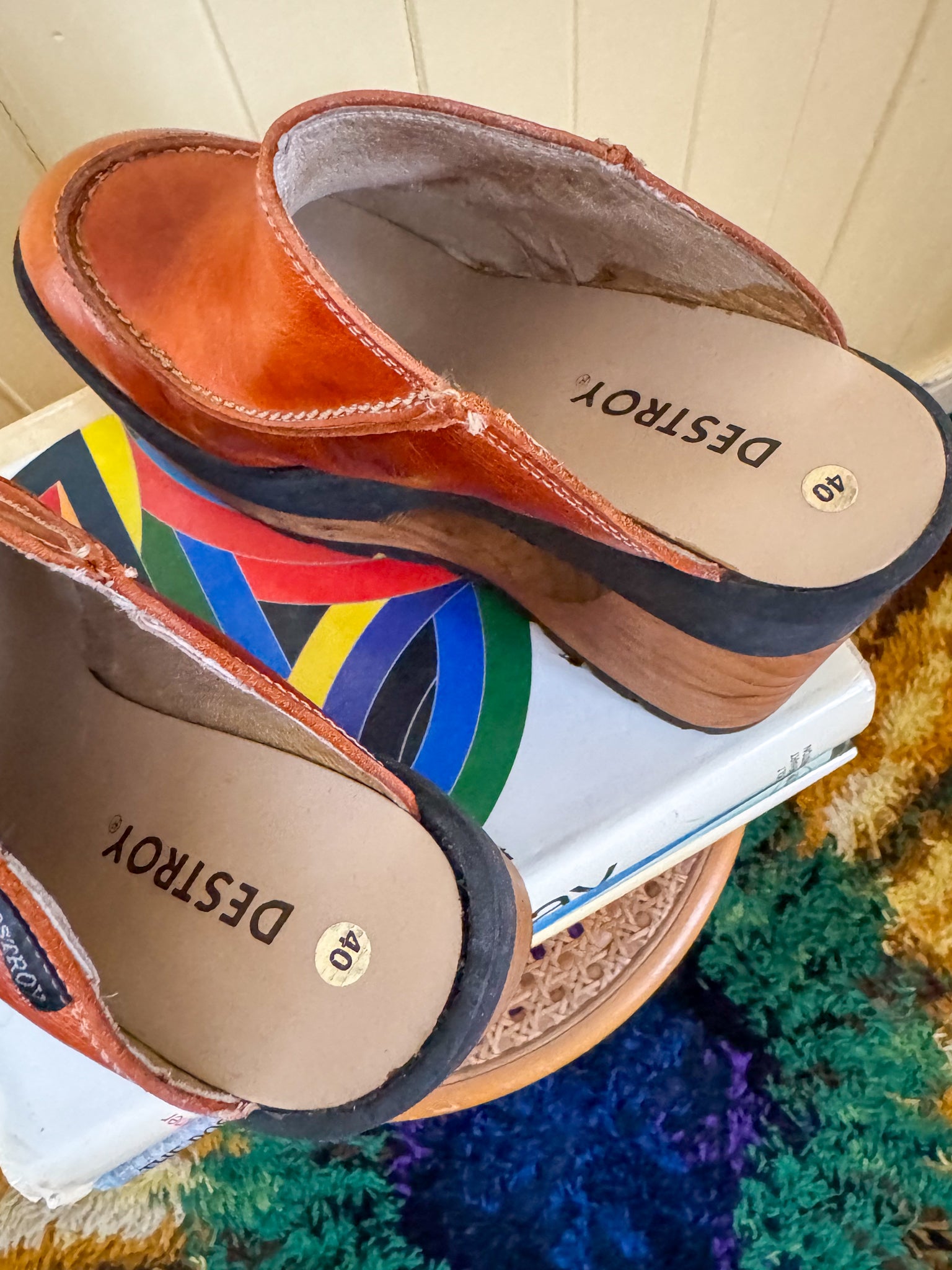 My 90s teen self would go WILD over these grunge alt dream wedges by iconic label Destroy. Crafted in a genuine leather in a rich tan hue, these groovy shoes feature the most insane mega platform wood and rubber open wedge sole. Honestly I’ve not even seen a similar pair for sale, and these babies appear to be deadstock and unworn as they have all their stickers still attached.
