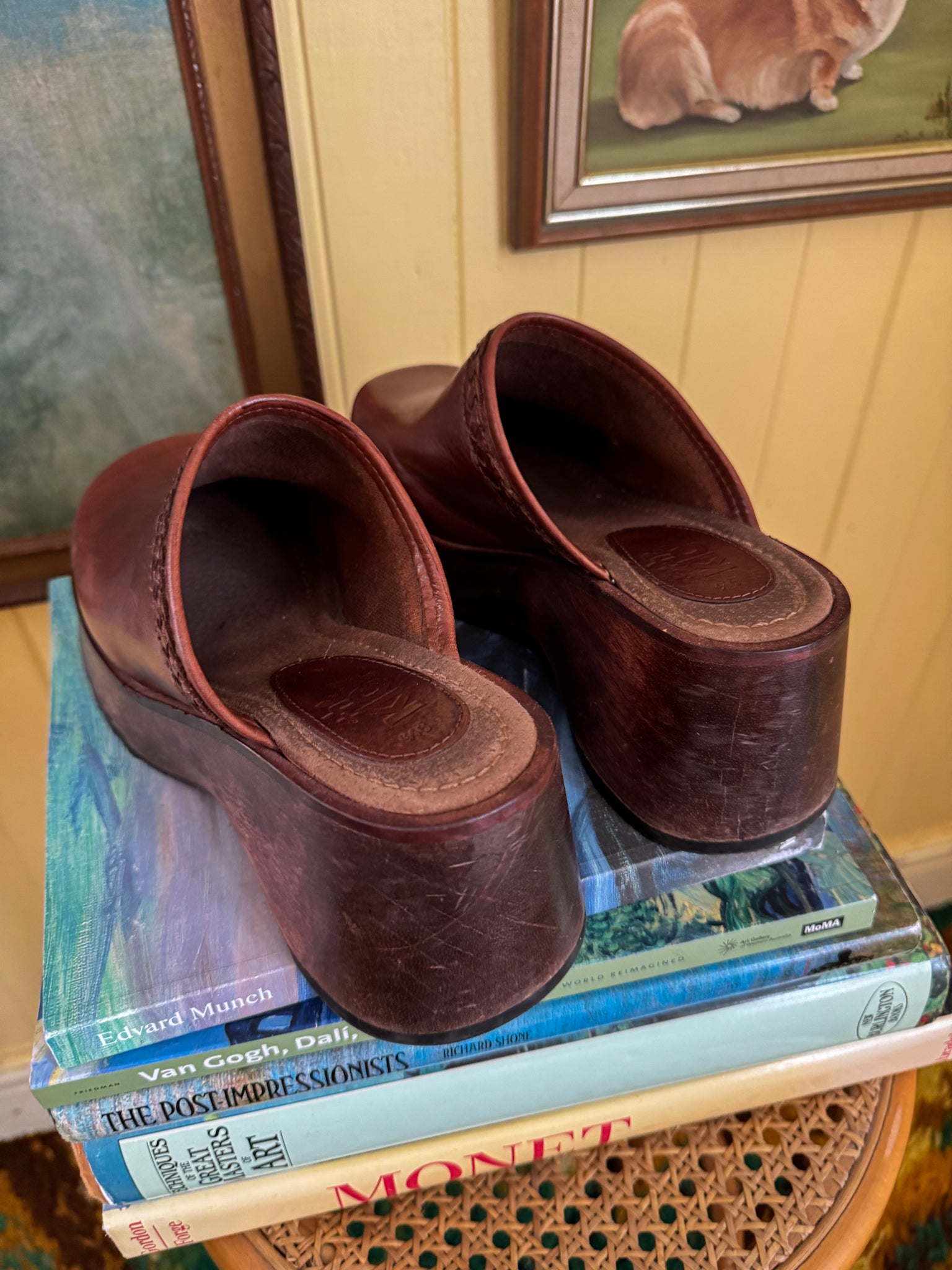 VINTAGE 1990S THE KICK LEATHER WOODEN PLATFORM CLOGS WEDGES 9.5/40.5