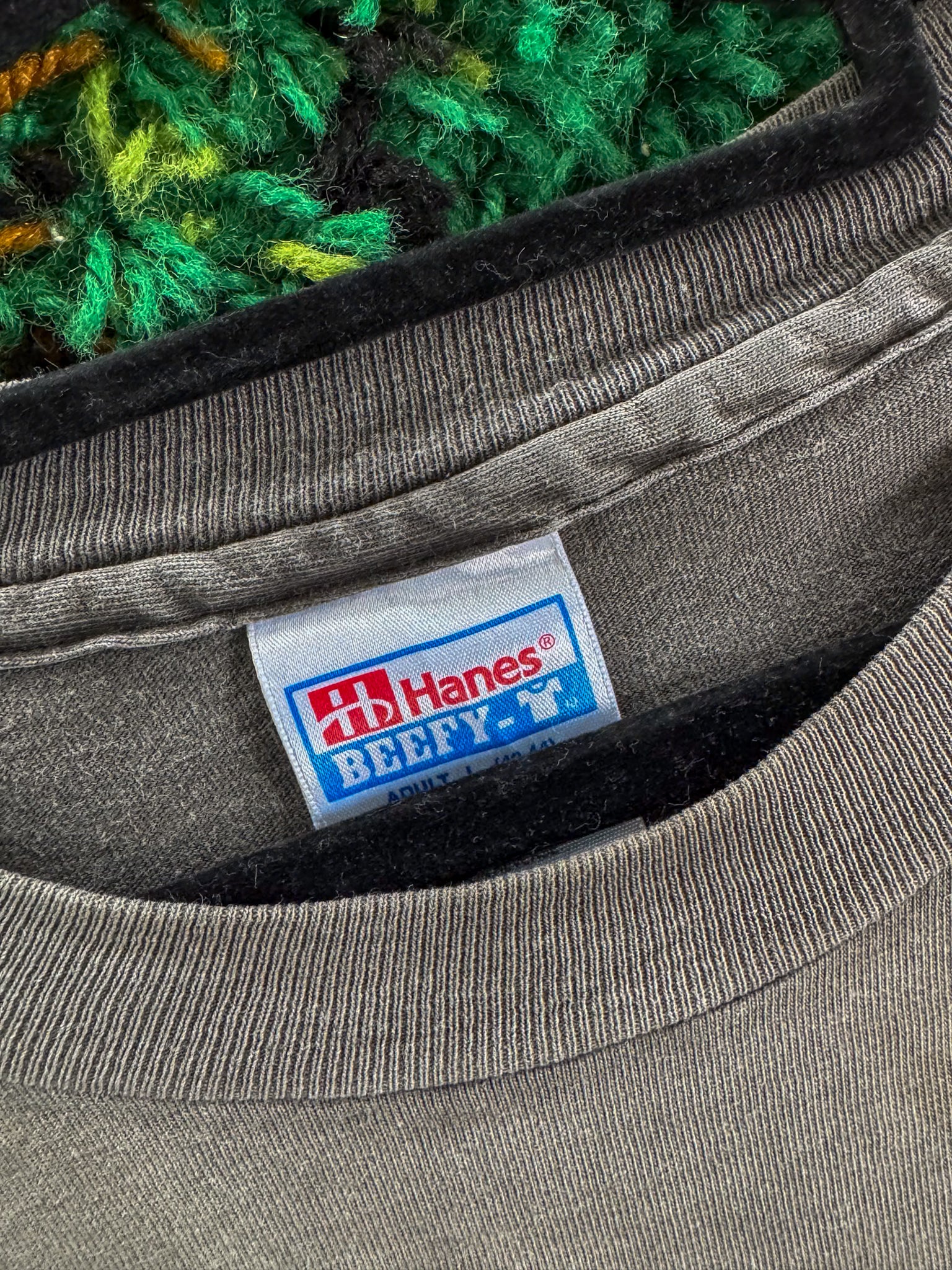 A groovy Bob Seger and the Silver Bullet Band souvenir tee from their 1996 It’s A Mystery North American tour, in a washed grey colourway. The tee is on a Hanes Beefy 100% cotton block and features a gorgeous print on the front and back and is cut in a regular tee silhouette.