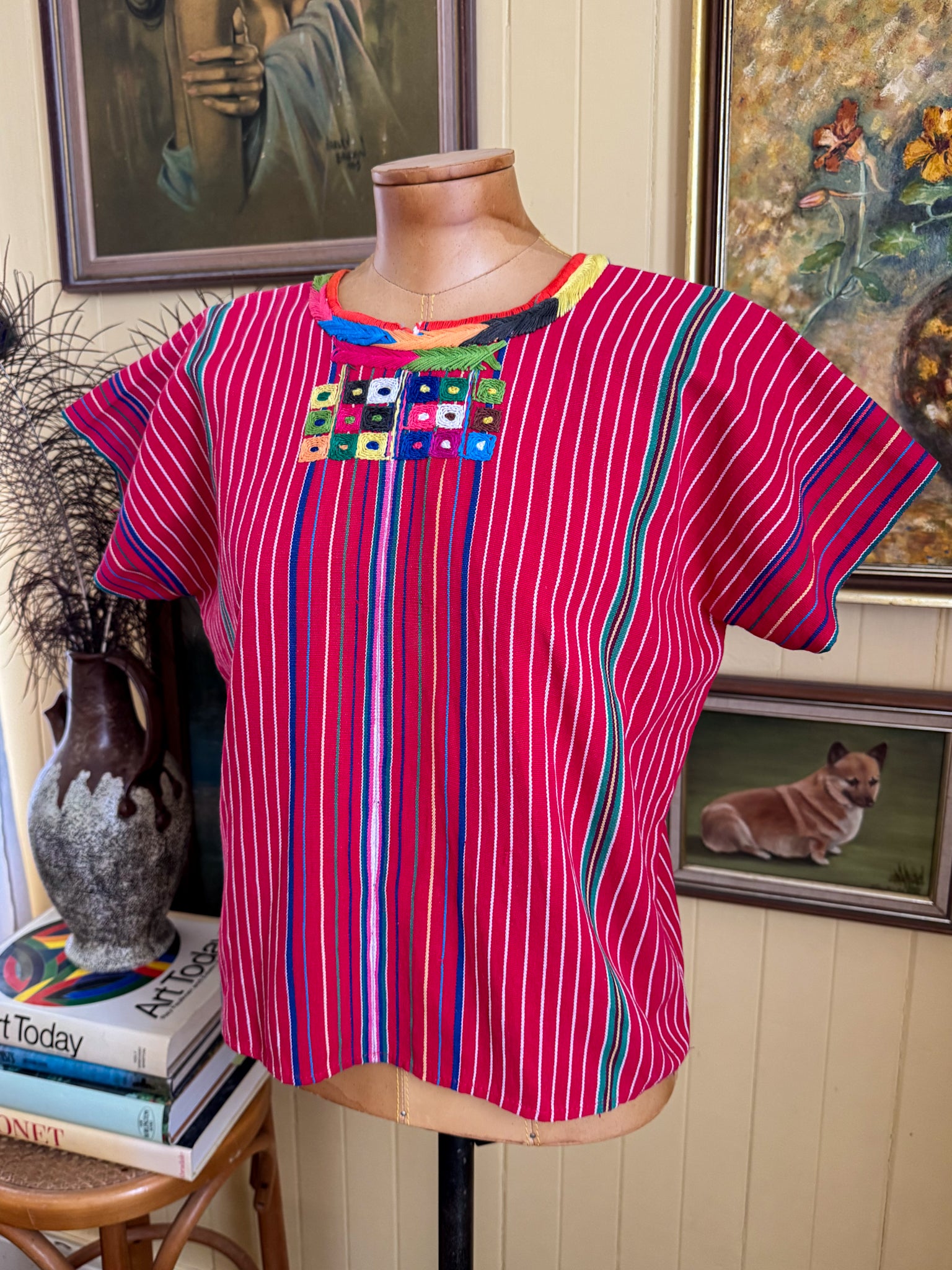 This is a stunning example of traditional craftsmanship. Handcrafted in Guatemala from a lush textured heavy weight woven cotton fabrication in a red stripe, this statement huipil style top features the beautiful embroidery detail throughout, a slightly cropped, boxy fit and falls to around hip length. Just divine.